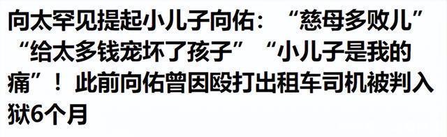 极目新闻,2025-10-14,向太罕见提起小儿子向佑:“慈母多败儿”“给太多钱宠坏了孩子”“小儿子是我的痛”!此前向佑曾因殴打出租车司机被判入狱6个月